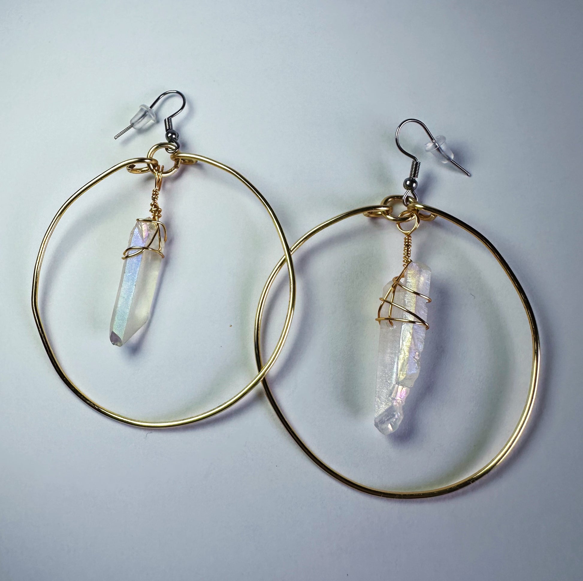 These luminous hoop earrings feature shimmering Angel Aura Quartz beads, suspended on delicate brass wire and finished with stainless steel ear hooks for comfort on sensitive ears. Angel Aura Quartz is known for its powerful healing energy, uplifting the spirit, and promoting peace, clarity, and emotional balance. It enhances intuition, strengthens your connection to higher guidance, and helps release stress and negativity, leaving you feeling refreshed and centered.
