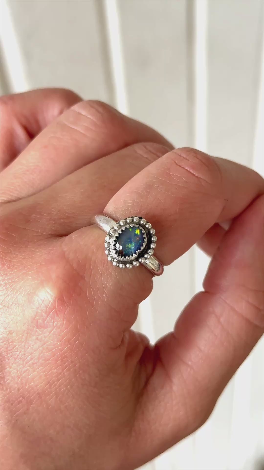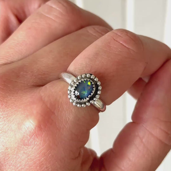 This magical Australian Opal Ring is Made To Order in your size, design choice, and choice of Opal! These opals remind me of the Agora Borealis because of their beautiful shades of blue and green.