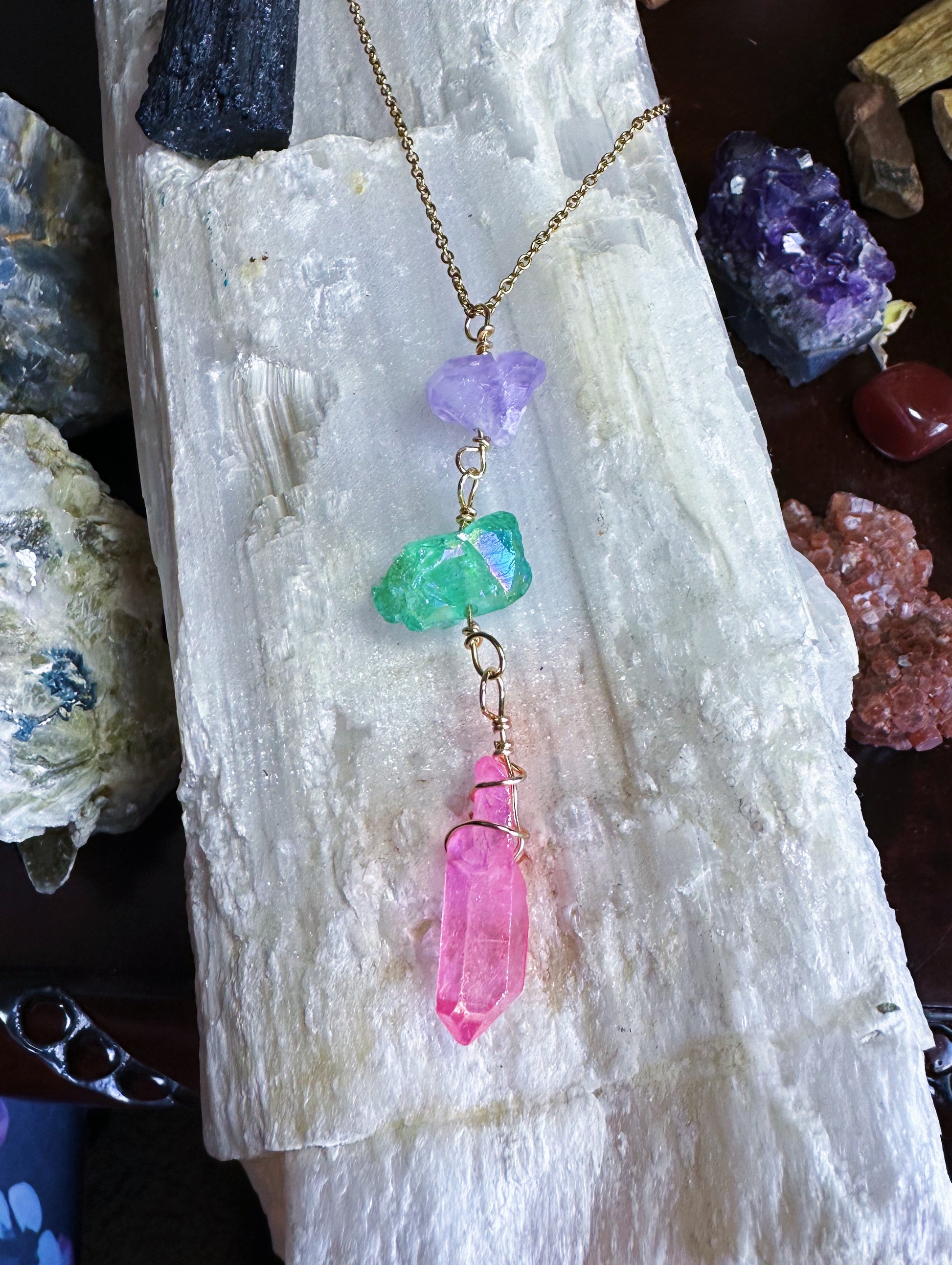This magical necklace inspired by mermaids features three different types of quartz. It features, amethyst, aqua aura quartz, and pink aura quartz.